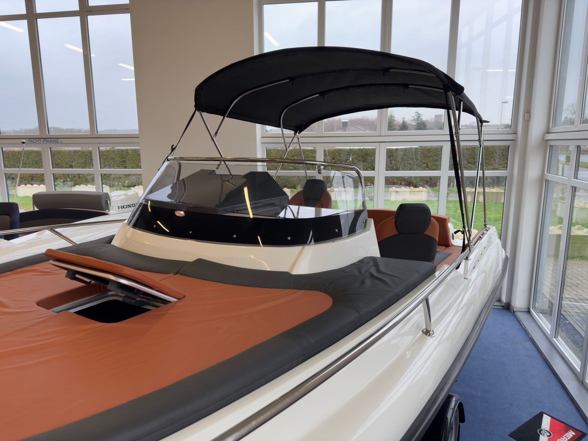 Entrée confortable via la zone avant, directement sur l'immense bain de soleil, via d'agréables marches dans le cockpit. Equipé d'un banc en forme de L et d'un garde-manger avec robinet d'eau douce et réfrigérateur à compresseur intégré. 6 personnes peuvent se détendre autour de la table de cockpit en teck. La barre moderne offre beaucoup d'espace pour les derniers systèmes de trim, les commandes du treuil d'ancre, le propulseur d'étrave et un grand traceur GPS/carte. De plus, les instruments moteur analogiques trouvent leur place. Un espace de stockage d'une taille unique pour les smartphones, les lunettes de soleil et les boissons est intelligemment intégré.